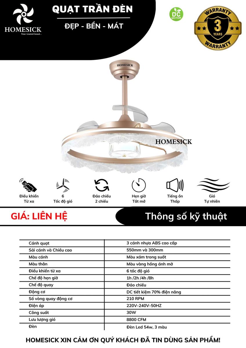 Quạt trần giấu cánh Homesick này có kiểu dáng sang trọng, cổ điển, tôn thêm giá trị căn phòng và ngôi nhà bạn.